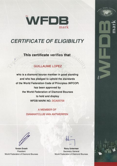 Guillaume LOPEZ, President of Maison GUIMEL, is a member of the very select Diamond Exchange of the DiamantClub Van Antwerpen - Member number: 05708.